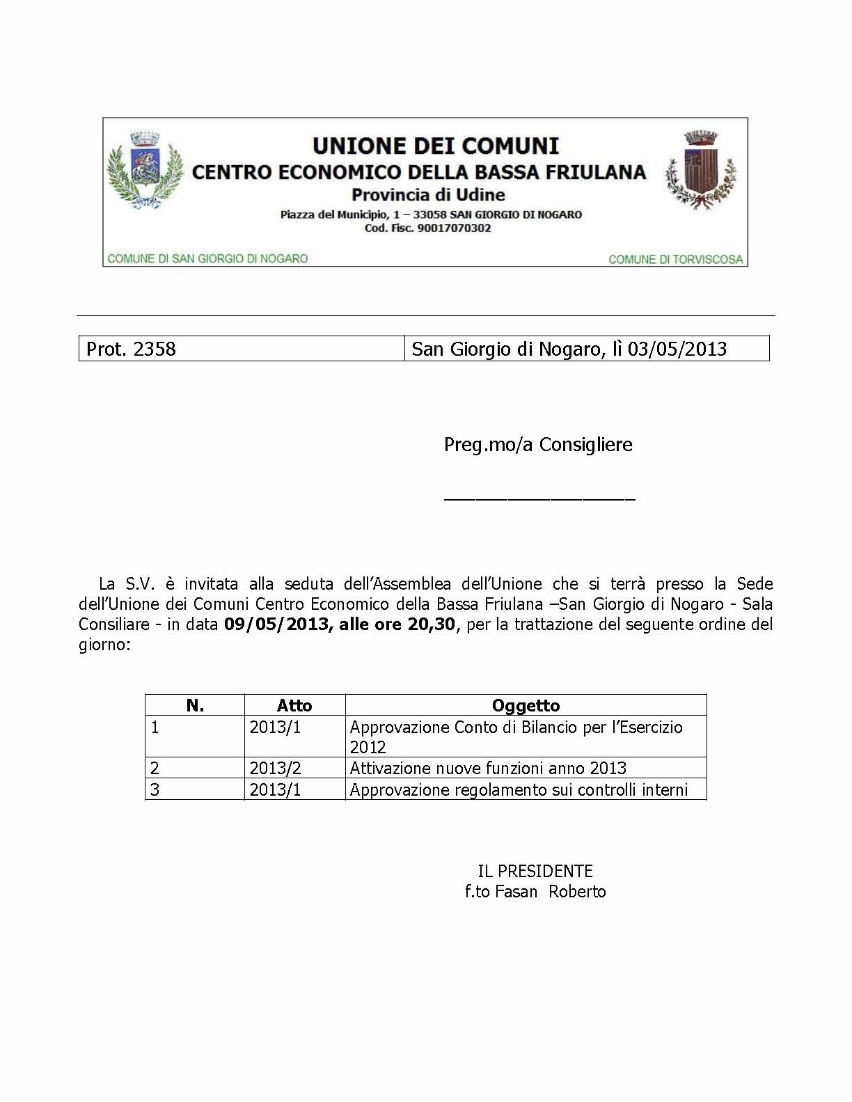 ASSEMBLEA UNIONE “CENTRO ECONOMICO BASSA FRIULANA” DEL 09/05/2013 ore 20.30 in Sala Consiliare a S. Giorgio di N.