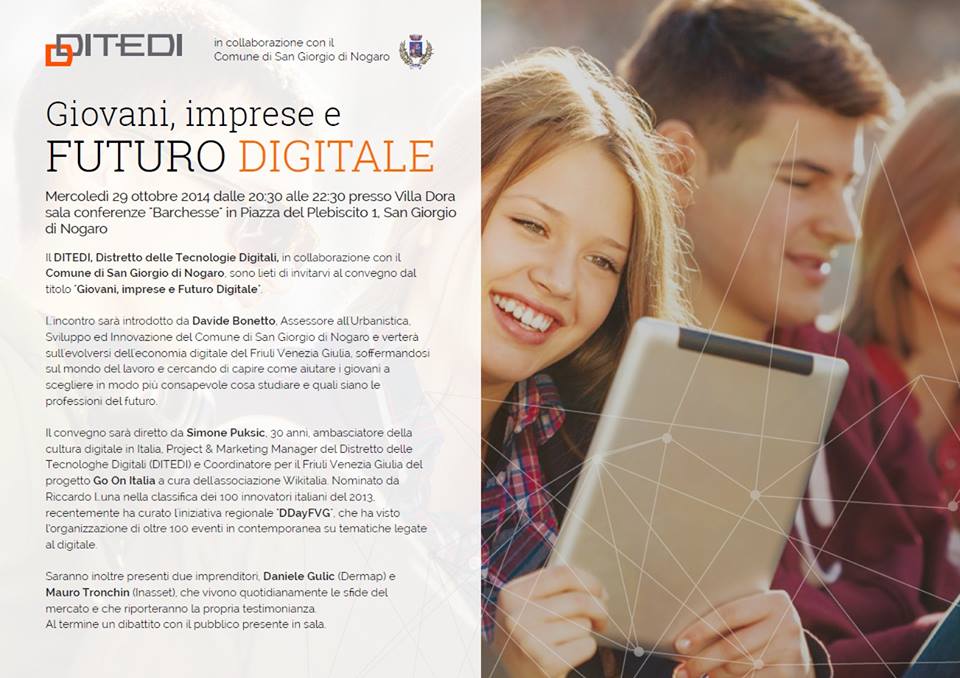 Mercoledì 29 ottobre 2014 dalle ore 20:15 presso la sala conferenze di Villa Dora a San Giorgio di Nogaro si parlerà di innovazione, imprese, giovani e futuro digitale durante il convegno organizzato dal DITEDI “Distretto delle Tecnologie Digitali” in collaborazione con il comune di San Giorgio di Nogaro e con il supporto di “S@ngiorgio2020”, una nuova aggregazione giovanile – che si presenterà ufficialmente durante la prima parte della serata – nata con lo con lo scopo di diffondere la cultura digitale e i vantaggi offerti dalle nuove Tecnologie dell’Informazione e della Comunicazione (TIC) coinvolgendo in modo attivo di tutti gli attori sociali, quali cittadini, organizzazioni, istituzioni, associazioni d’interesse e rappresentanza, realtà commerciali ed imprenditoriali locali.