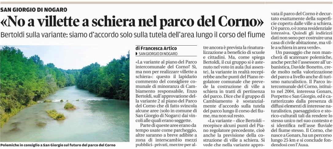 Oramai siamo abituati alle “sparate” del consigliere Bertoldi, a 360 gradi e su svariati i temi, dichiarazioni che molte volte sono palesemente infondate o addirittura contrastano con alcune sue posizioni (o non posizioni) dichiarate nelle varie sedute dei consigli comunali e/o commissioni competenti. L’ultima arriva sulla variante n.2 al Piano del “Parco Intercomunale del Fiume Corno”.